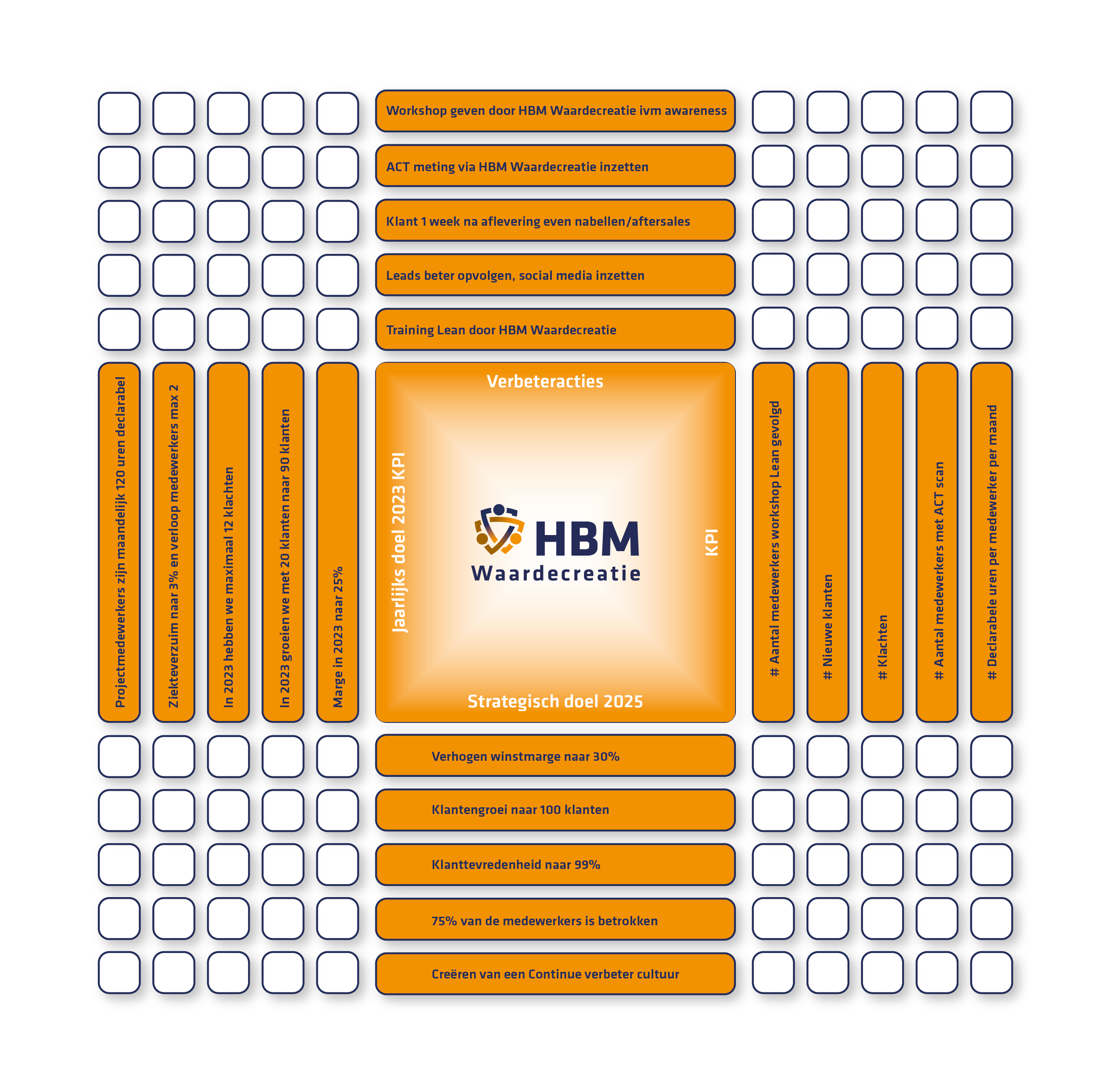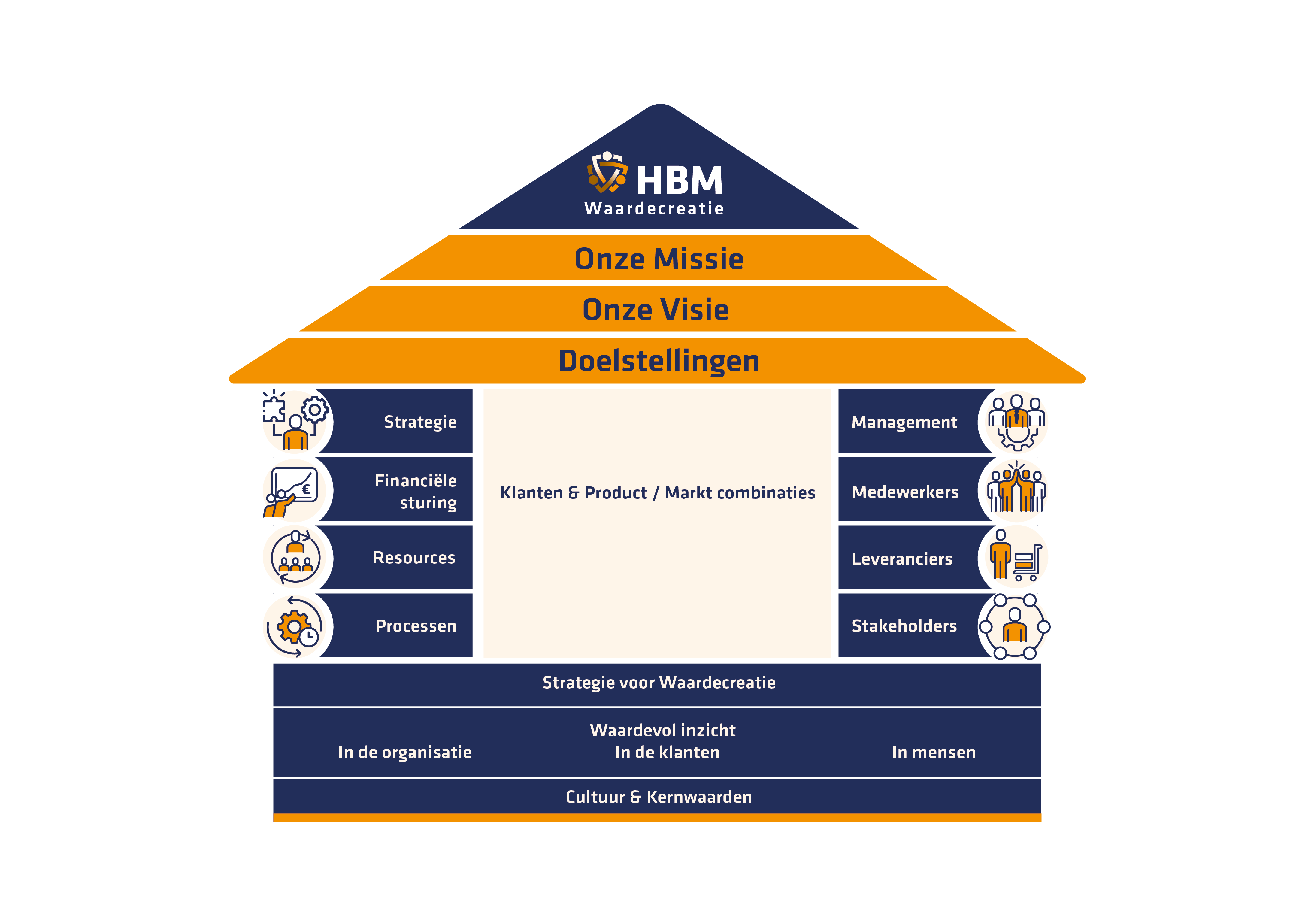 HBM Waardecreatie omarmt de theorie van Lerende Organisaties. Samen gaan we gericht ‘continue verbeteren’ en zijn gefocust op een doel in plaats van werken vanuit een blauwdruk. Ons credo is ‘gebruik de GBV-methode’. Gezond Boeren Verstand of wel Ga aan de slag, Bereik doelen en Verbeter continue, gewoon DOEN! Het HBM Waardecreatie Strategiehuis is ons kompas en het Actieplan zorgt voor resultaat.